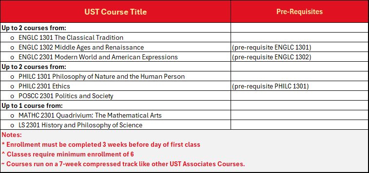 Students can easily move into a four-year bachelor’s degree at UST with this AA in General Studies degree with most of the courses transferrable. The Agreement between the Angelicum and UST provides that the 48 Great Books Credits and 12 Theology Online Credits (60 credits total) can be accepted as “transfer credit as college-level courses toward UST associate’s and/or bachelor’s degree(s).” Complete requirements for completion of a BA at UST after high school are determined by UST’s Agreement with the Angelicum and applicable provisions of UST Policy Number A.04.01 consistent with that agreement. They include: